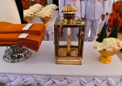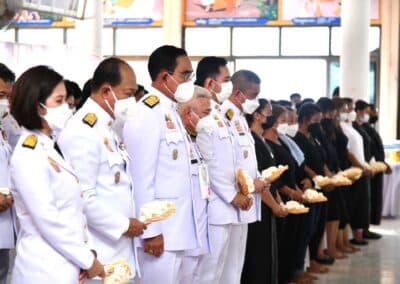 นายกรัฐมนตรีและผู้ร่วมพิธียืนสงบนิ่งเป็นเวลา 1 นาที จากนั้นนายกรัฐมนตรีทอดผ้าไตรพระราชทาน จำนวน 5 ไตร พระสงฆ์สมณศักดิ์ 5 รูป พิจารณาผ้าไตรบังสุกุล