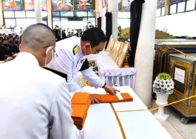 พันโท สมชาย กาญจนมณี รองเลขาธิการสำนักพระราชวัง วางดอกไม้จันทน์ของสมเด็จพระนางเจ้าสิริกิติ์ พระบรมราชินีนาถ พระบรมราชชนนีพันปีหลวง สมเด็จพระนางเจ้าฯ พระบรมราชินี และพระบรมวงศานุวงศ์ทุกพระองค์ พระพิธีธรรมสวดพระอภิธรรม