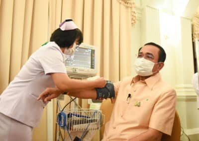 โดย ศ.นพ.ยง ภู่วรวรรณ หัวหน้าศูนย์เชี่ยวชาญเฉพาะทางด้านไวรัสวิทยาคลินิก เป็นผู้ฉีดวัคซีนแอสตราเซเนกาเข็มแรกให้แก่นายกรัฐมนตรี พร้อมสังเกตอาการหลังฉีดเบื้องต้นเป็นเวลา 30 นาที โดยนายกรัฐมนตรีกล่าวว่าชมว่า “มือเบา ไม่รู้สึกเจ็บเลย”