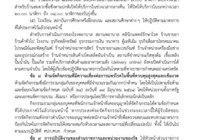 สําหรับการดําเนินการของโรงพยาบาล สถานพยาบาล คลินิกแพทย์รักษาโรค ร้านขายยา ร้านค้าทั่วไป โรงงาน ธุรกิจหลักทรัพย์ ธุรกรรมการเงิน ธนาคาร ตู้เอทีเอ็ม ธุรกิจสื่อสารโทรคมนาคม ไปรษณีย์และพัสดุภัณฑ์ ร้านจําหน่ายอาหารสัตว์ ร้านขายยาและเวชภัณฑ์ ร้านจําหน่ายเครื่องมือช่าง และอุปกรณ์ก่อสร้าง ร้านจําหน่ายสินค้าเบ็ดเตล็ดอันจําเป็น สถานที่จําหน่ายแก๊สหุงต้ม เชื้อเพลิง ปั้มน้ํามัน ปั้มแก๊ส รวมทั้งบริการส่งสินค้าและอาหารตามสั่ง (delivery online) ยังคงเปิดดําเนินการได้ ตามความจําเป็น โดยให้ผู้เกี่ยวข้องปฏิบัติตามมาตรการป้องกันโรคตามที่ทางราชการกําหนดอย่างเคร่งครัด