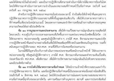 สําหรับการปฏิบัติงาน ณ สถานที่ตั้งของส่วนราชการหรือหน่วยงานของรัฐ ให้เปิดให้บริการ เฉพาะภารกิจที่เกี่ยวข้องกับบริการสาธารณสุข การควบคุมโรค กิจการที่เกี่ยวข้องกับระบบสาธารณูปโภค การจราจร การบรรเทาสาธารณภัย การรักษาความสงบเรียบร้อย หรืองานที่มีกําหนดเวลาปฏิบัติชัดเจน และได้นัดหมายไว้แล้วล่วงหน้า และเป็นการปฏิบัติงานที่สามารถดําเนินการได้ภายใต้มาตรการป้องกันโรค โดยให้พิจารณาดําเนินการตามความจําเป็นและเหมาะสมที่กําหนดไว้ในข้อกําหนด (ฉบับที่ ๒๗) ลงวันที่ ๑๐ กรกฎาคม พ.ศ. ๒๕๖๔