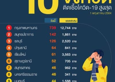 ส่วน 10 อันดับจังหวัดที่มีจำนวนผู้ติดเชื้อสูงสุดในประเทศวันนี้ ได้แก่ 1.กทม. 739 ราย 2.สมุทรปราการ 142 ราย 3.ชลบุรี 126 ราย 4.ปทุมธานี 64 ราย 5.เชียงใหม่ 61 ราย 6.สุราษฎร์ธานี 52 ราย 7.สมุทรสาคร 46 ราย 8.นครศรีธรรมราช 46 ราย 9.นนทบุรี 44 ราย และ 10.ระนอง 33 ราย พี่น้องประชาชนที่อยู่ในพื้นที่ 10 อันดับนี้ขอให้ท่านใส่ใจสุขสักษณะส่วนตัวเพื่อที่จะได้สามารถลดตัวเลขลงให้ได้โดยไว เพราะภาพรวมสถานการณ์ประเทศก็ยังทรงๆ ตนขอเรียนข้อมูลตรงๆ ไม่มีปิดบัง เพราะไม่จำเป็นต้องปิดบังใดๆ