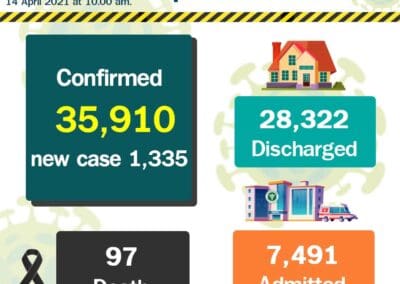 ส่วนการฉีดวัคซีน ระหว่างวันที่ 28 กุมภาพันธ์ – 13 เมษายน 2564 มีผู้รับวัคซีน สะสมทั้งหมด จำนวน 579,305 ราย วันที่ 13 เมษายน 2564 มีผู้รับการฉีดวัคซีน เข็มที่ 1 จำนวน 529 ราย เข็มที่ 2 จำนวน 244 ราย