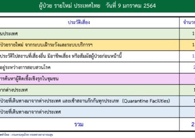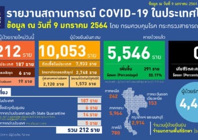 นพ.ทวีศิลป์ วิษณุโยธิน โฆษกศูนย์บริหารสถานการณ์การแพร่ระบาดของโรคติดเชื้อไวรัสโคโรนา 2019 (ศบค.) แถลงข่าวสถานการณ์การระบาดโรคติดเชื้อไวรัส โควิด-19 ประจำวันที่ 9 ม.ค.2564 ว่า วันนี้ประเทศไทย พบผู้ป่วยยืนยันติดเชื้อรายใหม่จำนวน 212 ราย ติดเชื้อประเทศ 187 ราย แรงงานต่างด้าว 6 ราย เดินทางกลับมาจากประเทศ 19 ราย รวมผู้ติดเชื้อสะสม 10,053 ราย โดยหายดีและกลับบ้านแล้ว 5,546 ราย รักษาตัวอยู่ 4,440 ราย ไม่มีผู้เสียชีวิตเพิ่ม รวมยอดผู้เสียชีวิตอยู่ที่ 67 ราย