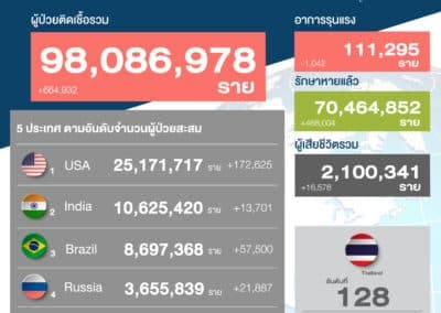 สถานการณ์การติดเชื้อ COVID-19 ในประเทศ วันที่ 22 มกราคม 2564 Posted by Admin | Jan 22, 2021 | ข่าวประจำวัน นศุกร์ที่ 22 มกราคม 2564 สถานการณ์การติดเชื้อ COVID-19 ในประเทศ ผู้ป่วยรายใหม่ 309 ราย ผู้ป่วยยืนยันสะสม 13,104 ราย หายป่วยแล้ว 10,224 ราย เสียชีวิตสะสม 71 ราย Post Views: 23 FacebookFacebookXTwitterLINELine