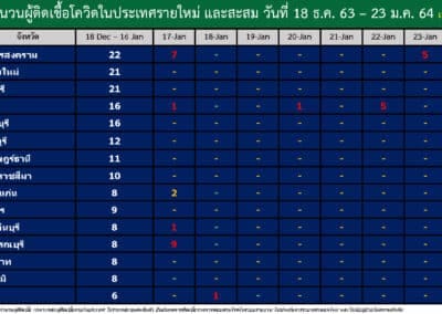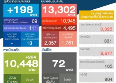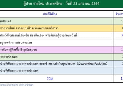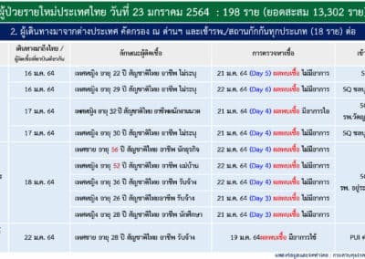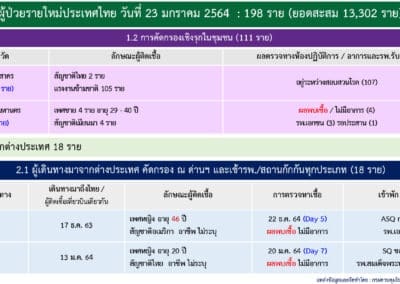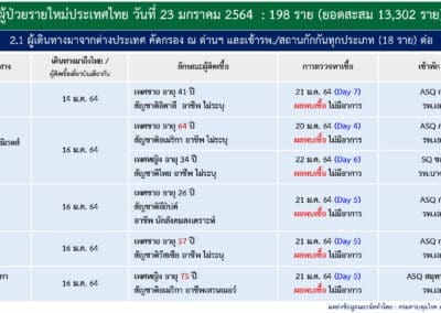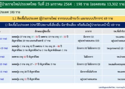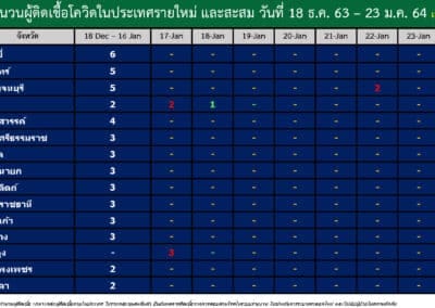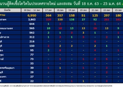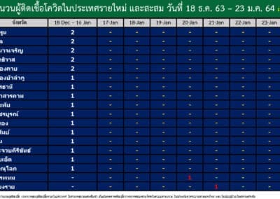 สถานการณ์การติดเชื้อ COVID-19 ในประเทศ วันเสาร์ที่ 23 มกราคม 2564 Posted by Admin | Jan 23, 2021 | ข่าวประจำวัน วันเสาร์ที่ 23 มกราคม 2564 สถานการณ์การติดเชื้อ COVID-19 ในประเทศ ผู้ป่วยรายใหม่ 198 ราย ผู้ป่วยยืนยันสะสม 13,302 ราย หายป่วยแล้ว 10,448 ราย เสียชีวิตสะสม 72 ราย Post Views: 27 FacebookFacebookXTwitterLINELine