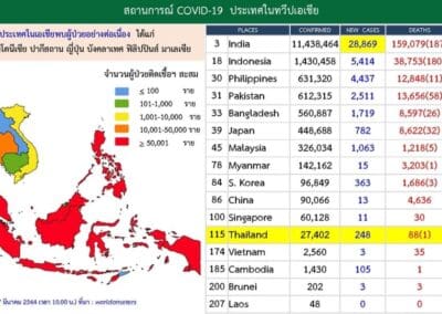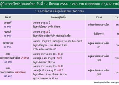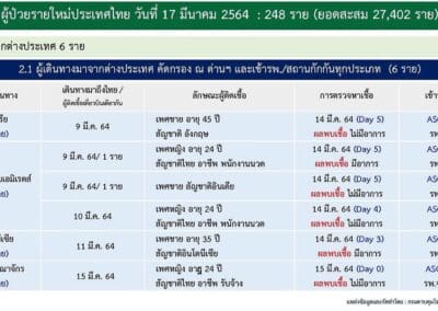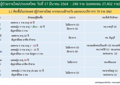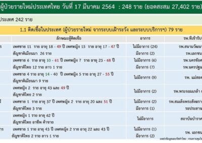 สถานการณ์การติดเชื้อ COVID-19 ในประเทศ วันพุธที่ 17 มีนาคม 2564 Posted by Admin | Mar 17, 2021 | ข่าวประจำวัน วันพุธที่ 17 มีนาคม 2564 สถานการณ์การติดเชื้อ COVID-19 ในประเทศ ผู้ป่วยรายใหม่ 248 ราย ผู้ป่วยยืนยันสะสม 27,402 ราย หายป่วยแล้ว 26,339 ราย เสียชีวิตสะสม 88 ราย Post Views: 48 FacebookFacebookXTwitterLINELine