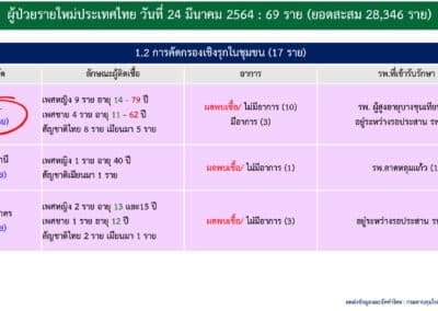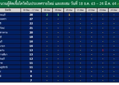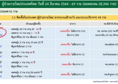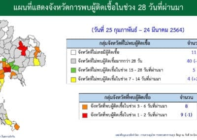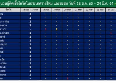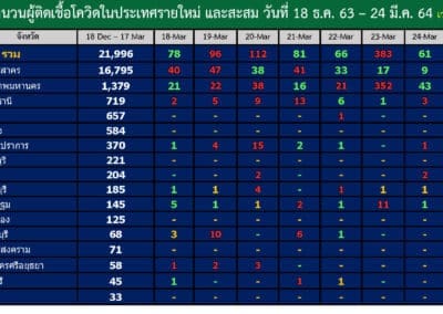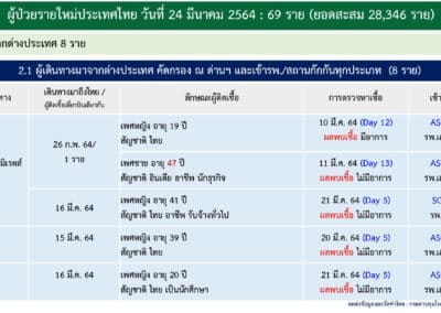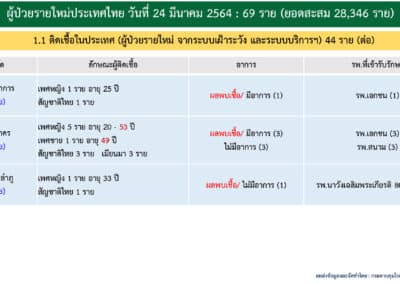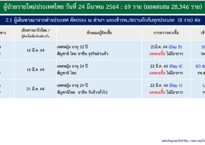 สถานการณ์การติดเชื้อ COVID-19 ในประเทศ วันพุธที่ 24 มีนาคม 2564 Posted by Admin | Mar 24, 2021 | ข่าวประจำวัน วันพุธที่ 24 มีนาคม 2564 สถานการณ์การติดเชื้อ COVID-19 ในประเทศ ผู้ป่วยรายใหม่ 69 ราย ผู้ป่วยยืนยันสะสม 28,346 ราย หายป่วยแล้ว 26,873 ราย เสียชีวิตสะสม 92 ราย Post Views: 47 FacebookFacebookXTwitterLINELine