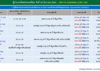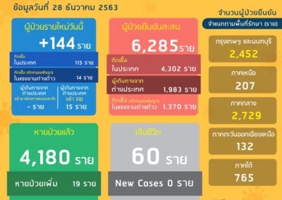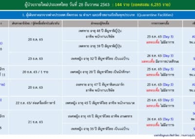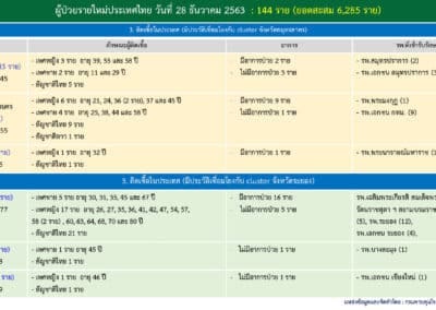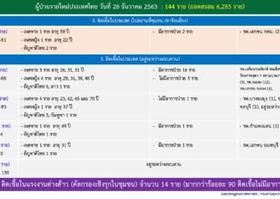สถานการณ์การติดเชื้อ COVID-19 วันจันทร์ ที่ 28 ธันวาคม 2563 Posted by Admin | Dec 28, 2020 | ข่าวประจำวัน วันจันทร์ที่ 28 ธันวาคม 2563 เวลา 11.30 น. สถานการณ์การติดเชื้อ COVID-19 ผู้ป่วยรายใหม่ 144 ราย ผู้ป่วยยืนยันสะสม 6,285 ราย หายป่วยแล้ว 4,180 ราย เสียชีวิตสะสม 60 ราย รายละเอียดสำหรับผู้ติดเชื้อรายใหม่ 144 ราย 1. ผู้ที่เดินทางมาจากตปท. (SQ) 15 ราย 2. ผู้ติดเชื้อภายในประเทศ 115 ราย 3. เเรงงานต่างด้าว 14 ราย Post Views: 39 FacebookFacebookXTwitterLINELine