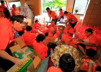 และระดับสาม คือ จัดทำถุงน้ำใจ เป็นข้าวสาร อาหารแห้งและน้ำ เพื่อเป็นการบรรเทาความเดือดร้อนได้อีกระยะหนึ่ง และในการแจกจ่ายเราจะใช้วิธีการประสานงานกับท้องถิ่นท้องที่กับผู้นำชุมชนว่าส่วนไหนที่ได้รับแล้วและส่วนไหนที่เดือดร้อนจริงๆ ให้เสนอมาที่ศูนย์เป็นการทำงานร่วมกันทั้งผู้ให้และผู้รับ