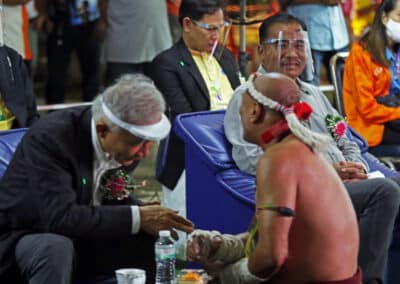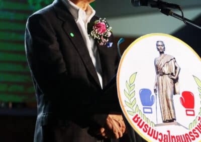 “วันนี้ กระแสมวยไทยเป็นที่รู้จักกันทั่วโลก ใครก็แล้วแต่พอดูมวยไทยก็จะทราบว่า เป็นกีฬาของชาติไทย มวยไทย กีฬาของคนไทย เค้าเรียกว่า มวยไทย กีฬามวยไทย เป็นที่มีชื่อประเทศ เป็นประเภทของกีฬา ฟุตบอล ก็ไม่ได้บอกว่าเป็นฟุตบอลที่ไหน เทนนิสก็ไม่ได้บอกว่า เทนนิสที่ไหน แต่กีฬามวยไทยบอกว่าเป็นมวยและบอกว่าเป็นที่ไหน ผมอยากให้พี่น้องประชาชนชาวไทยทั้งประเทศ ได้ภาคภูมิใจ และการที่เราได้ช่วยกันรักษา คุณค่าวัฒนธรรมของชาติ เป็นส่วนสำคัญที่ทำให้เราๆรู้สึกว่าเราเป็นพวกเดียวกัน ก่อให้เกิดความรัก ความสามัคคีกัน เวลาเราเห็นมวยไทย เราจะรู้สึกห่วงแหนความเป็นเจ้าของ สิ่งต่างๆเหล่านี้ก็จะทำให้เกิดความรักความสามัคคี