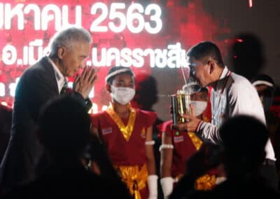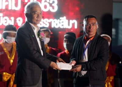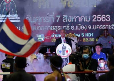 นอกจาก กีฬามวยไทยจะสร้างให้เกิดการรักชาติ และสร้างความสุข สิ่งหนึ่งที่ได้ คือเรื่องเศรษฐกิจสำคัญ ตอนนี้เราก็มีความกังวลใจกัน โควิดจบหรือยัง คนตกงานกัน คนไม่มาเที่ยว เมื่อไรโควิดจะจบ จะมาเที่ยวเมืองไทยเหมือนเดิมหรือเปล่า ผมจึงเรียนว่ากีฬามวย ควรอยู่ในปฎิทินของนักท่องเที่ยวเลยเวลามาเที่ยวเมืองไทยก็ต้องมี หนึ่ง สอง สาม สี่ ห้า หนึ่งในนั้น ก็จะต้องดูมวยไทย และตอนนี้พัฒนาไปอีกขั้นหนึ่งแล้ว นอกจากมาดูมวยไทยแล้วต้องมาเรียนมวยไทย ผมยังคิดเลยว่า ที่พิมาย ที่กำลังก่อสร้าง “อนุสาวรีย์ ยักษ์สุข” ที่พิมาย ถ้าเราสามารถรื้อฟื้นตำนาน มวยไทยโคราชและก็สร้างยิมเนเซียม สำหรับสอน เหมือนกับเป็น ตรรกศิลา ของมวยไทยโคราช อยู่ที่บ้านรังกาใหญ่ ที่พิมาย และก็หยิบตำรา วิชายุทธ์ การต่อสู้ ท่าทางต่างๆ ใครอยากเรียนมวยไทยโคราช ไปที่พิมาย ได้ ก็จะไปถึงต้นตำรับ มวยเมืองไทยโคราช ทำให้เป็นจุดท่องเที่ยว นอกจากนักท่องเที่ยวจะมาซื้อผ้าไหม มากราบคุณย่าโม แล้วอันหนึ่งก็คือ มาเยี่ยมมวยไทยโคราช ไปดูมวยไทยโคราช เรียนมวยไทยโคราช อันนี้ก็จะเป็นการส่งเสริม เรื่องเศรษฐกิจ เรื่องการท่องเที่ยว และก็ทำให้เกิดอัตลักษณ์ มวยไทยโคราช เป็นที่ยอมรับและเป็นที่รู้จัก อันนี้ก็ฝากท่านประธานชมรม มวยไทยนคราชสีมา ในการที่จะช่วยกัน อนุรักษ์มวยไทย และก็หยิบมวยไทยโคราช ขึ้นมาเพื่อให้เกิดการพัฒนา และเพื่อความภาคภูมิใจของพี่น้องประชาชนชาวโคราช ต่อไปด้วย