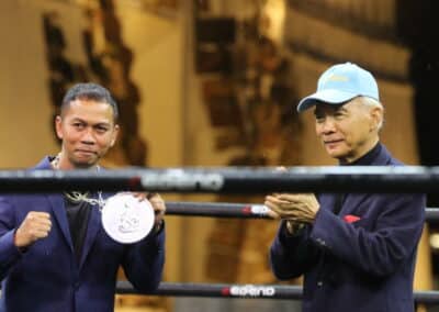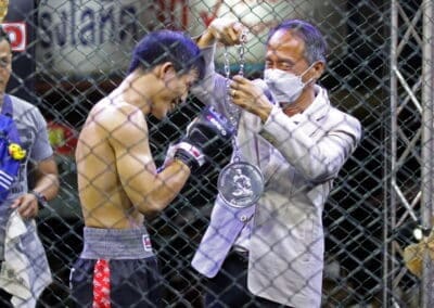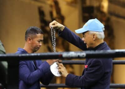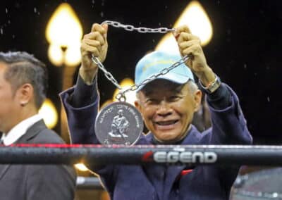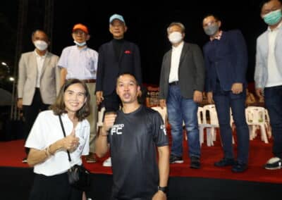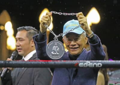 สุดท้ายที่ผมจะกล่าวว่าโคราชเป็นเมืองมวย แล้วอยากให้ทุกคนภูมิใจ วันนี้มีนักมวยนักกีฬาที่ประสบความสําเร็จที่คณะผู้จัดจะมอบเหรียญหลวงพ่อคูณ รุ่น ‘Legend FC’ Legend เป็นภาษาอังกฤษ แปลว่าตํานาน , F มาจาก Fighting , C มาจากแชมเปี้ยนชิพก็คือ เหรียญตํานานของนักชกผู้ยิ่งใหญ่