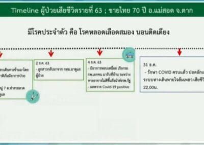 รายที่สองเป็นชายอายุ 70 ปี อ.แม่สอด จ.ตาก มีโรคประจำตัวเส้นเลือดในสมอง นอนติดเตียง เข้าประเทศไทยผ่านช่องทางธรรมชาติ 29 พ.ย.63 มีอาการเหนื่อยหอบต้นเดือนธันวาคม ได้ทำการรักษาโควิด-19และตรวจไม่พบเชื้อ แต่พบว่ามีภาวะแทรกซ้อน และปอดอักเสบระบบทางเดินหายใจล้มเหลว เสียชีวิตเวลา 22.00 น.วันที่ 31 ธ.ค.63