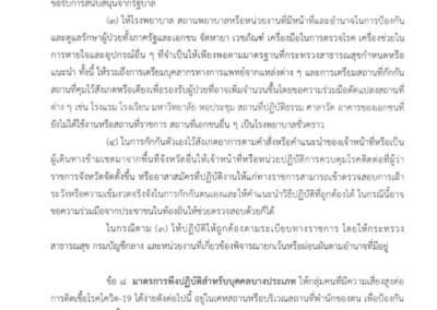 (3) ให้โรงพยาบาล สถานพยาบาลหรือหน่วยงานทั้งภาครัฐและเอกชน จัดหายา เวชภัณฑ์ เครื่องมือในการตรวจโรค เครื่องช่วยในการหายใจและอุปกรณ์อื่น ๆ ที่จำเป็นให้เพียงพอตามมาตรฐานที่กระทรวงสาธารณสุขกำหนดหรือแนะนำ ทั้งนี้ รวมถึงการเตรียมบุคลากรทางการแพทย์ และการเตรียมสถานที่กักกัน สถานที่คุมไว้สังเกต หรือเตียง เพื่อรองรับผู้ป่วยที่อาจเพิ่มจำนวนขึ้น โดยขอความร่วมมือดัดแปลงสถานที่ต่าง ๆ เช่น โรงแรม โรงเรียน มหาวิทยาลัย หอประชุม สถานที่ปฏิบัติธรรม ศาลาวัด อาคารของเอกชนที่ยังไม่ได้ใช้งาน หรือสถานที่ราชการ สถานที่เอกขนอื่น ๆ เป็นโรงพยาบาลชั่วคราว