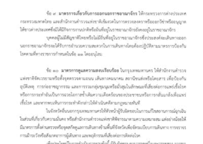 10 มาตรการดูแลความสงบเรียบร้อยในกรุงเทพฯ ให้สำนักงานตำรวจแห่งชาติจัดเวรยามหรือตั้งจุดตรวจตามถนน เส้นทางคมนาคม สถานีขนส่งหรือโดยสาร เพื่อป้องกันอุบัติเหตุ การก่ออาชญากรรม และการวมกลุ่มชุมนุมหรือมั่วสุมในลักษณะที่เสี่ยงต่อการแพร่เชื้อโรค หากพบเห็นให้ดำเนินคดีตามกฎหมายทันที