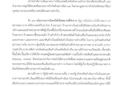 12 สถานที่ที่เปิดให้บริการตามปกติ ได้แก่ โรงพยาบาล สถานพยาบาล คลินิกแพทย์รักษาโรค ร้านขายยา ร้านอาหารที่ไม่ใช่สถานบันเทิง แผงจำหน่ายอาหาร ร้านสะดวก ร้านค้าทั่วไป ห้างสรรพสินค้า (แผนกซูปเปอร์มาร์เก็ต แผนกขายยา แผนกอาหาร แผนกสินค้าเบ็ดเตล็ดที่จำเป็นต่อการดำรงชีวิต) โรงงาน ธุรกิจหลักทรัพย์ ธุรกรรมการเงิน ธนาคาร ตู้เอทีเอ็ม ตลาดและตลาดนัด (ส่วนที่จำหน่ายอาหารสด อาหารแห้ง อาหารปรุงสำเร็จ อาหารสัตว์ เวชภัณฑ์และสินค้าเบ็ดเตล็ดที่จำเป็น) สถานที่จำหน่ายแก๊สหุงต้ม เชื้อเพลิง ปั๊มน้ำมัน ปั๊มแก๊ส การให้บริการขนส่งผู้โดยสารและขนส่งสินค้า รวมทั้งบริการส่งสินค้าและอาหารตามสั่ง (delivery online) รวมถึงหน่วยงานของรัฐ ยังคงเปิดดำเนินการในวันและเวลาราชการตามปกติ เว้นแต่ที่มีประกาศให้ปิดหรืองดดำเนินการไปก่อนแล้ว เช่น สถาบันการศึกษา