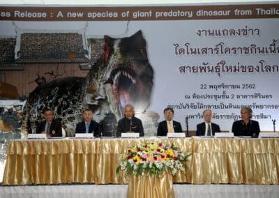 วันนี้ (22 พฤศจิกายน 2562) ที่สถาบันวิจัยไม้กลายเป็นหินและทรัพยากรธรณีภาคตะวันออกเฉียงเหนือ เฉลิมพระเกียรติ มหาวิทยาลัยราชภัฏนครราชสีมา ต.สุรนารี อ.เมือง จ.นครราชสีมา นายสุวัจน์ ลิปตพัลลภ อดีตรองนายกรัฐมนตรี และนายกสมามหาวิทยาลัยราชภัฏนครราชสีมา ได้เป็นประธานในการแถลงข่าวเปิดตัวไดโนเสาร์โคราชกินเนื้อสายพันธุ์ใหม่ขนาดใหญ่ของโลก “สยามแรปเตอร์ สุวัจน์ติ” ขึ้น โดยมีผู้ร่วมแถลงข่าว ประกอบไปด้วย นายสมหมาย เตชวาล อธิบดีกรมทรัพยากรธรณี, นายจรัสชัย โชคเรืองสกุล รองผู้ว่าราชการจังหวัดนครราชสีมา, ผู้ช่วยศาสตราจารย์ ดร.อดิศร เนาวนนท์ อธิการบดีมหาวิทยาลัยราชภัฏนครราชสีมา, ดร.ดวงสุดา โชคเฉลิมวงศ์ ผู้สนับสนุนการอนุรักษ์และวิจัยฟอสซิล, ดร.โยอิชิ อาซูมะ (Dr. Yoichi Azuma) ผู้อำนวยการพิเศษพิพิธภัณฑ์ไดโนเสาร์จังหวัดฟูกุอิ ประเทศญี่ปุ่น และผู้ช่วยศาสตราจารย์ ดร.ประเทือง จินตสกุล ผู้อำนวยการสถาบันวิจัยไม้กลายเป็นหินฯ ร่วมเสนอผลงานวิจัย ท่ามกลางสื่อมวลชนและผู้สนใจเข้าร่วมงานกว่า 100 คน