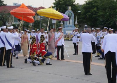 ต่อมา ทรงพระดำเนินออกทางประตูวิเศษไชยศรีไปยังหน้าศาลหลักเมือง ทรงโบกพระหัตถ์ทักทายประชาชน ที่ชูพระบรมฉายาลักษณ์พระบาทสมเด็จพระเจ้าอยู่หัวและสมเด็จพระนางเจ้าฯ พระบรมราชินีขึ้นเหนือศีรษะ โบกธงสีเหลืองและสีม่วง บริเวณเต็นท์ด้านข้างศาลาลูกขุน ในพระบรมมหาราชวัง