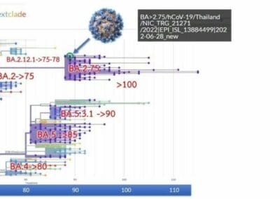 ไวรัส BA.2.75 มีการกลายพันธุ์ต่างไปจากไวรัสดั้งเดิมอู่ฮั่นประมาณ 90 ตำแหน่ง โดยพบ BA.2.75 อุบัติขึ้นครั้งแรกในประเทศอินเดีย ขณะนี้แพร่ระบาดไปทั่วโลก นักวิทยาศาสตร์สามารถเก็บตัวอย่างถอดรหัสพันธุกรรมได้ 338 ราย (ข้อมูล ณ วันที่ 19 ก.ค.65)